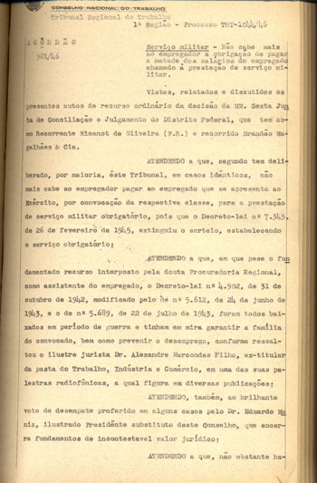Primeiro acórdão proferido pelo TRT da 1ª Região, nos autos do processo nº TRT-1044/1946, quando da passagem da Justiça do Trabalho para o Poder Judiciário pela Constituição de setembro de 1946. A questão principal deste documento é se cabia ou não ao empregador, a obrigação de pagar metade do salário ao empregado chamado à prestação do serviço militar, baseado em legislação baixada durante a Segunda Guerra Mundial. |