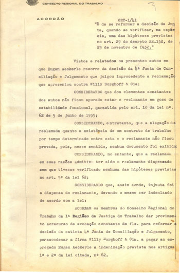 O Acórdão CRT 01/1941 foi o primeiro publicado pelo Conselho Regional do Trabalho da 1ª Região, em 30 de julho de 1941, e julgou um “recurso de avocação” sobre o pagamento ou não de indenização por demissão injusta. |