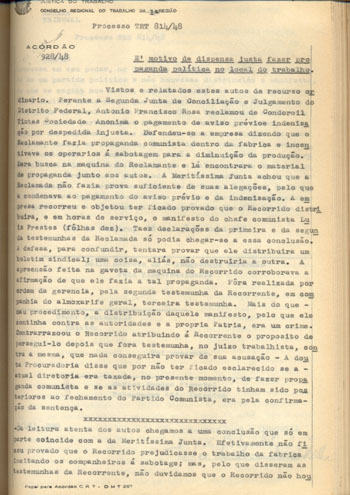 A Guerra Fria proporcionou um cenário internacional que repercutiu imediatamente no Brasil com a cassação do Partido Comunista do Brasil, em maio de 1947. Inserido nesse contexto, o acórdão 928/1948, inscrito no processo TRT 814/1948, reforma a sentença, confirmando a demissão por justa causa de um operário, argumentando abuso por parte deste dos seus direitos de associação e manifestação política. |