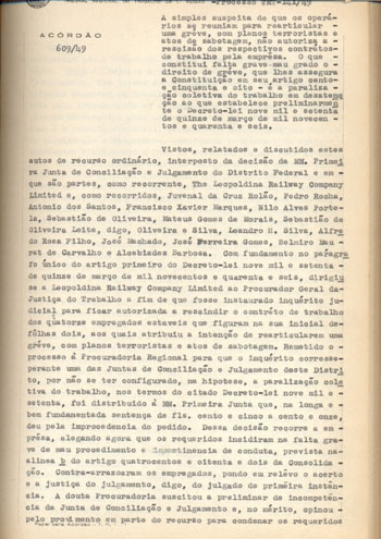 O Acórdão inscrito no processo TRT 141/1949, alude ao direito de greve e às suas implicações para a sociedade. Não obstante instituições, como neste caso a Procuradoria Geral e a Polícia, contribuírem para o controle e repressão de movimentos sociais, ressalta-se a posição da Justiça do Trabalho, que se expressou na defesa da garantia constitucional básica da livre associação. |