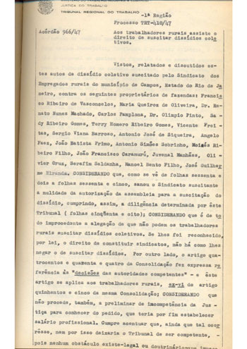 As leis trabalhistas e a ação da Justiça do Trabalho sinalizam uma nova presença do Estado no campo das relações de trabalho. Este acórdão de lavra do Exmo Juiz Délio Maranhão, inscrito no processo TRT 410/1947, constitui um exemplo disso, ao julgar um dissídio coletivo suscitado pelo Sindicato dos empregados rurais do município de Campos, a fim de estabelecer aumento salarial para a categoria. |