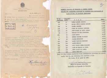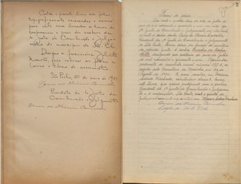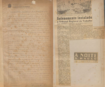 Ata da sessão solene de instalação do Conselho Regional do Trabalho da 2ª Região, na qual constam as autoridades presentes no ato de criação da Justiça do Trabalho no estado de São Paulo. Entre os presentes constam o professor Cesarino Júnior, o advogado Rio Branco Paranhos, autoridades do Judiciário e do Executivo estadual e federal. |