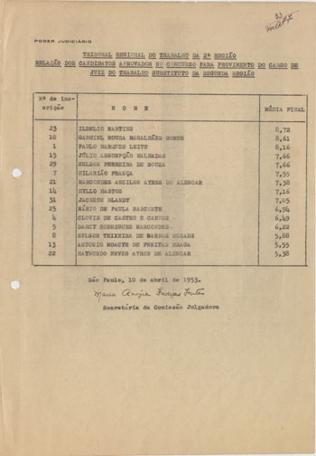 Trata-se do primeiro concurso realizado no âmbito do TRT-2 para provimento de cargos de juiz do trabalho da 2ª Região. Constam os nomes dos primeiros juízes a ingressarem na carreira da magistratura via concurso na Justiça do Trabalho da 2ª Região. |
