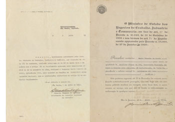 Portarias de nomeação do servidor Mário Pimenta de Moura no Ministério dos Negócios do Trabalho, Indústria e Comércio (1934) e no Conselho Regional do Trabalho da 2ª Região (1941). Mário Pimenta de Moura é considerado o primeiro servidor do CRT-2, foi o primeiro secretário da presidência. |