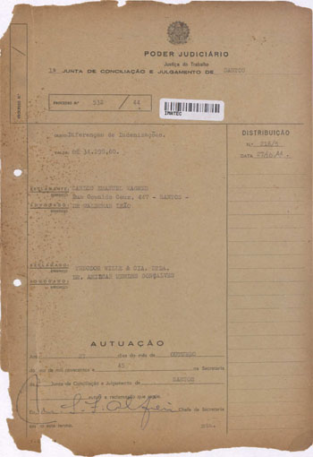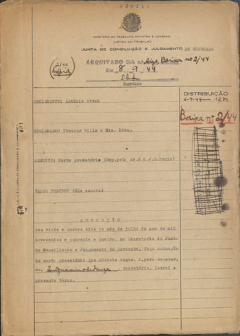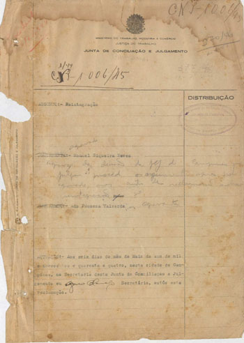 Processo oriundo da Justiça Comum, é o primeiro processo da Junta de Conciliação e Julgamento de Campinas. Foi integrado ao acervo do CRT-2 em 1944 com a criação da Junta de Conciliação de Campinas. |