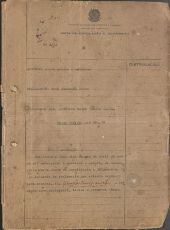 Processo inicialmente postulado na Delegacia Regional do Trabalho, antes da criação dos CRTs. Foi distribuído para a 1ª JCJ de São Paulo em 1941. Tem a Santa Casa de Misericórdia como reclamada. |