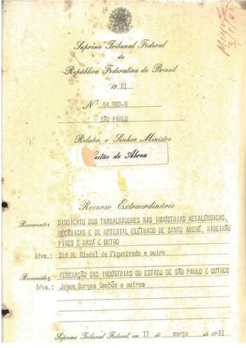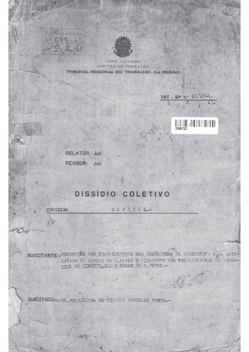 Dissídio Coletivo instaurado pela Federação das Indústrias da Construção e do Mobiliário do Estado de São Paulo, em razão da greve na Cia Portland de Perus. A greve durou quase 9 meses. O processo contém parecer do jurista Cesarino Júnior. |
