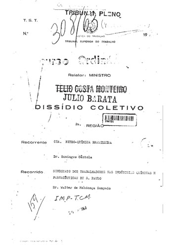 Em outubro de 1963 diversas categorias iniciam um conjunto de paralisações coordenadas, a chamada "greve dos 700 mil". O TRT-2 decidiu por apensar os dissídios desse período em um único processo (DC 320/1963). O DC 308/1963, no qual a empresa Nitroquímica pede pela declaração da ilegalidade da greve é um desses dissídios. |