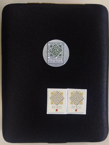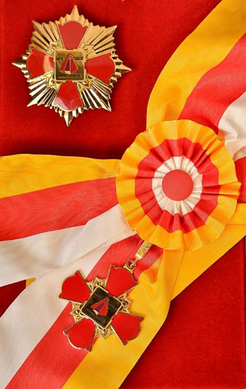 Cruz em metal medindo 40mm; faixa de seda chamalotada em vermelho, branco e amarelo, medindo 30mm de largura; roseta de lapela revestida de seda chamalotada, medindo 10mm de diâmetro; estojo retangular vermelho, medindo 15x8x3cm |