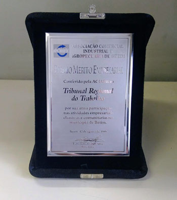 Prêmio enviado pelo presidente Fernovedes Clareth Silva, da Associação Comercial Industrial e Agropecuária de Betim, ao Tribunal Regional do Trabalho da 3ª Região por sua ativa participação nas atividades empresariais classistas e comunitárias no município de Betim. |