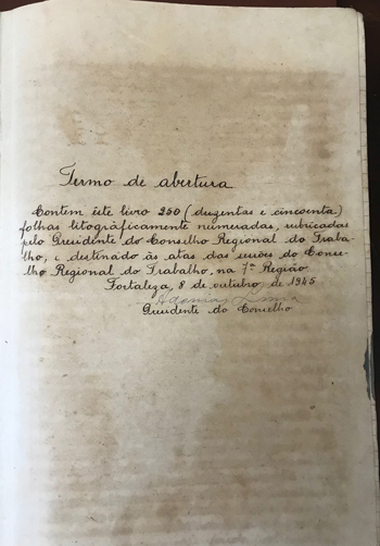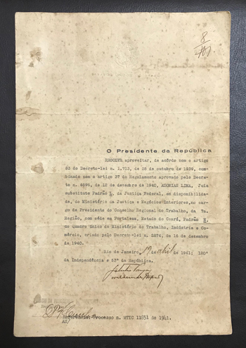Documento de posse do Desembargador Adonias Lima ao cargo de Presidente do Conselho Regional do Trabalho da 7ª Região em 19 de abril de 1941 |