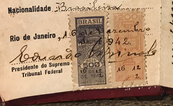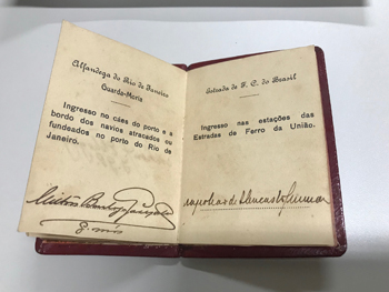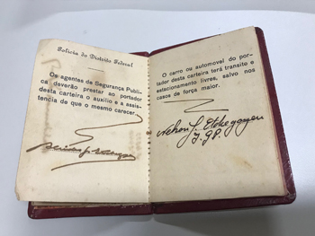 Carteira de identidade para os ministros do Supremo Tribunal Federal da década de 40. documento pertencente ao Min. Waldemar Cromwell do Rêgo Falcão. No verso da 2ª folha do documento constam as seguintes informações escritas a mão: naturalidade; data de nascimento; filiação; “côr” e nacionalidade. O Documento foi assinado, pelo presidente do Supremo Tribunal Federal o Min. Eduardo Espínola (1940 – 1945), no Rio de Janeiro, 16 de dezembro de 1942. Nesta folha constam dois selos datados. Na 3ª folha constam o nº de série, o nº de seção, uma foto e a assinatura do Min. Waldemar Falcão. No Verso da 3ª folha instruções, da Policia do Distrito Federal para os agentes de Segurança Pública, para o auxilio necessário ao portador da carteira. Na 4ª folha autorização para “O carro ou automóvel do portador desta carteira terá estacionamento e transito livres, salvo nos casos de força maior.” No verso da 4ª folha autorização da Alfandega do Rio de Janeiro – Guarda-Moria na 5ª folha autorização para o ingresso nas estações das Estradas de Ferro da União. No verso da 5ª Folha “O Ministro do Supremo Tribunal Federal aposentado conserva o título e s honras inerentes ao cargo (Dec. n.º 6787 de 30 de janeiro de 1941)” |