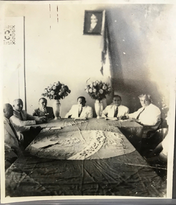 No centro da mesa, Dr. Juarez Bastos, Presidente da Junta. À direita, Dr. Mozart Coreano Aderaldo, Suplente de Presidente; Mozart Sólon, Vogal dos Empregados. À esquerda, José de Oliveira Albuquerque, Vogal dos empregados e Antônio Fernandes Jardim, Secretário da Junta |