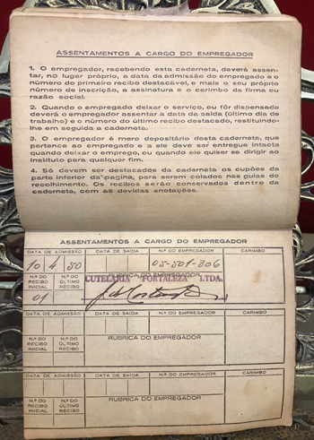 Caderneta de Contribuições de Francisco Chagas Menezes Filho, Nº 6677057, nascido em 10/06/1927´, admitido em 10 de abril de 1950, na Cutelaria Fortaleza LTDA. |
