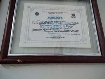 Diploma da Diretoria de Ensino da Polícia Militar do estado de Rondônia, pelos relevantes serviços prestados ao Sistema de Ensino Profissional da PMRO. |