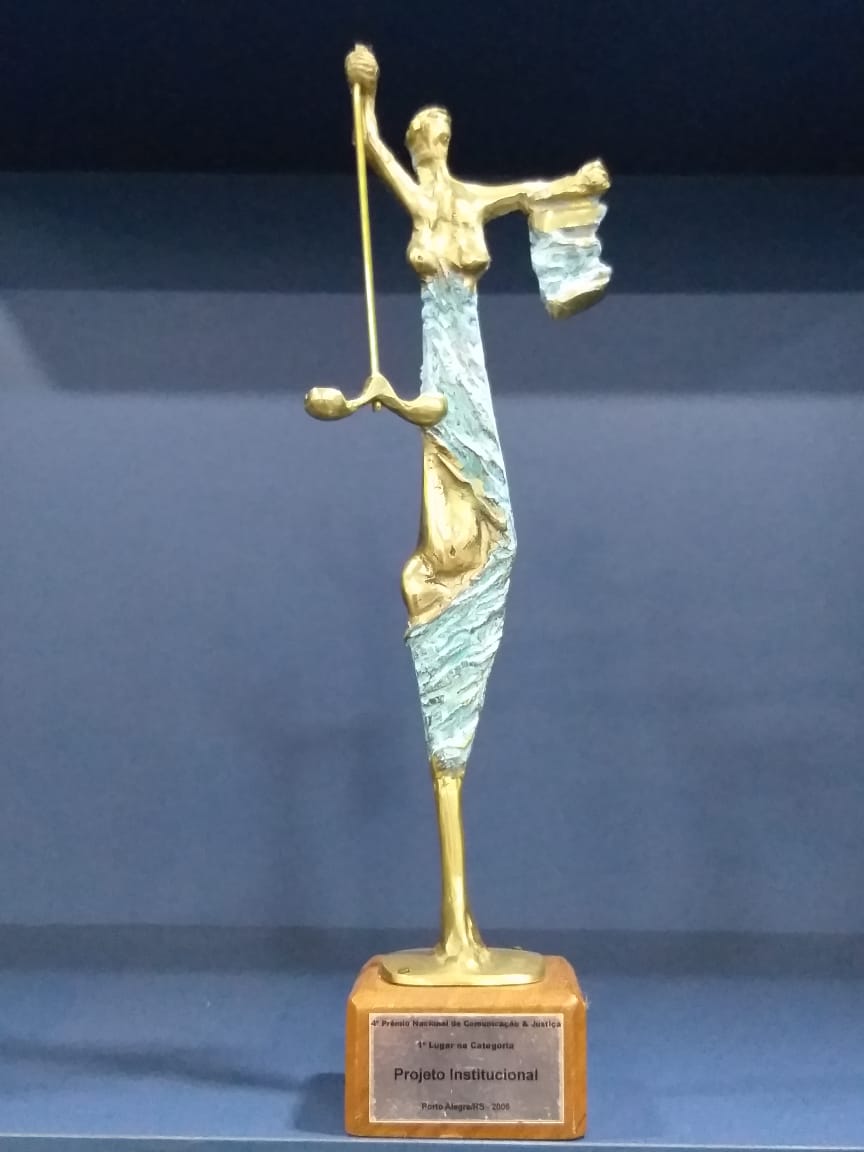 Prêmio em bronze e madeira, escultura da justiça estilizada. Encontra-se no espaço do Memorial -14 |
