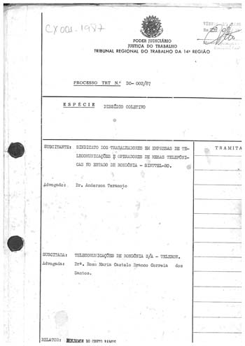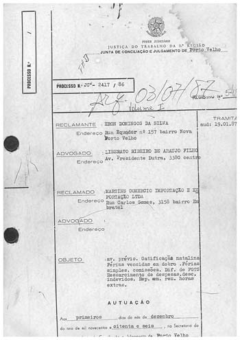 Primeiro processo autuado, após a instalação do Tribunal Regional do Trabalho da 14ª Região, sob nº 2417/1986, em que são partes: Eron Domingos da Silva, Reclamante, e Martins Comércio Importação e Exportação Ltda, Reclamado |