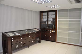 Armário de exposição de medalhas de condecorações e livros (à esquerda). Armário de exposição de fitas VHS, fotografias e certificados (ao fundo). |