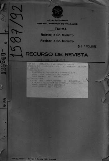 RT contra a BRASPEROLA por parte do SINDICATO DOS TRABALHADORES NA INDÚSTRIA DE FIAÇÃO E TECELAGEM DE VITÓRIA - SINDTEXTIL requerendo o reajuste salarial devido as perdas salariais do plano econômico conhecido como "Plano Collor". Magistrado julgou o pedido procedente nos termos da fl. 195. Recursos não tiveram provimento para reformar a decisão. Este processo está em destaque no Livro dos 20 Anos do TRT-ES (fl. 154). |