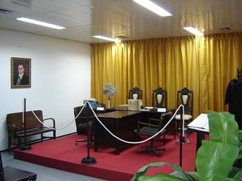 Mesa de madeira maciça fabricada nos anos 40 para compor a sala de audiência do tribunal. Atualmente abriga uma máquina de escrever. |
