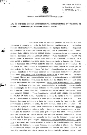 Trata-se de um documento histórico, que se refere à Ata da primeira sessão administrativa extraordinária do TRT da 24ª Região. |