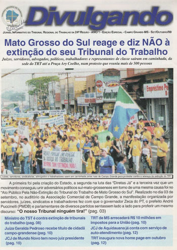 Trata-se de um documento histórico, que se refere à edição especial do DIVULGANDO - jornal informativo do TRT da 24ª Região, elaborado em prol do movimento contra a extinção da Justiça do Trabalho Brasileira. |