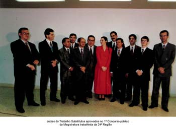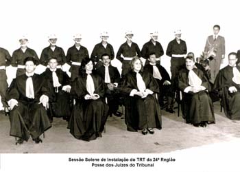 Sessão Solene de Instalação do TRT da 24ª Região - Posse dos Juizes do Tribunal. Juízes Togados (1ª fila, da direita para a esquerda): Márcio Eurico Vitral Amaro, Presidente do TRT da 24ª Região (1993-1994), Abdalla Jallad, Vice-Presidente do TRT 24ª Região, Daisy Vasques, Geralda Pedroso, André Luís Moraes de Oliveira. Juízes Classistas (2ª fila, da direita para a esquerda): Antônio Falcão Alves; Idelmar da Mota Lima, Nelson Azambuja Almirão e Luís Araldo Skibinsk. |