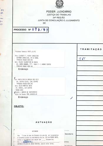 Primeira reclamação trabalhista ajuizada na primeira Junta de Conciliação e Julgamento do TRT da 24ª Região. |