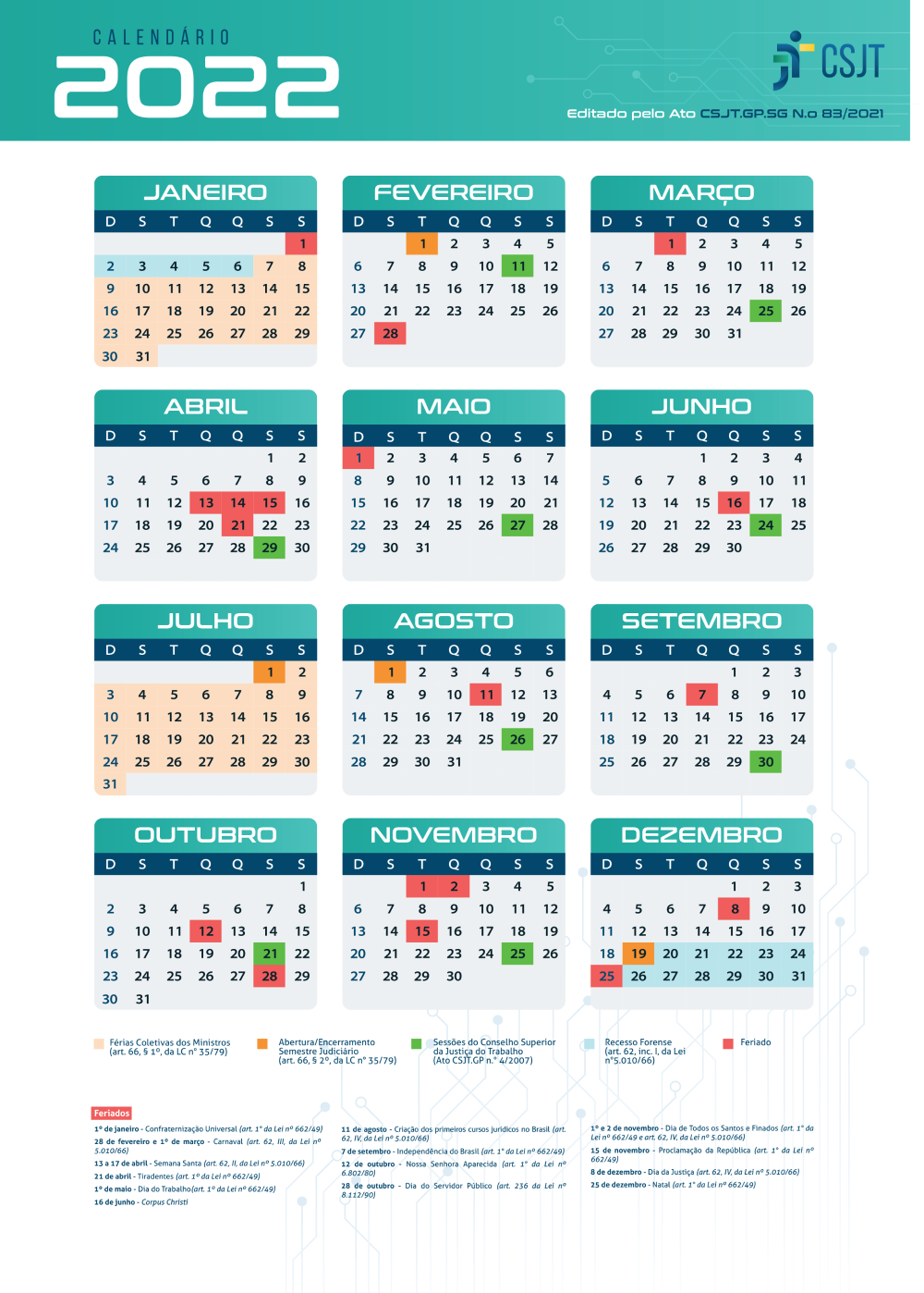 3/11/2021 - O Conselho Superior da Justiça do Trabalho (CSJT) disponibilizou o seu calendário oficial para 2022, com todo o cronograma de datas das sessões ordinárias, feriados e recessos previstos para o ano que vem.