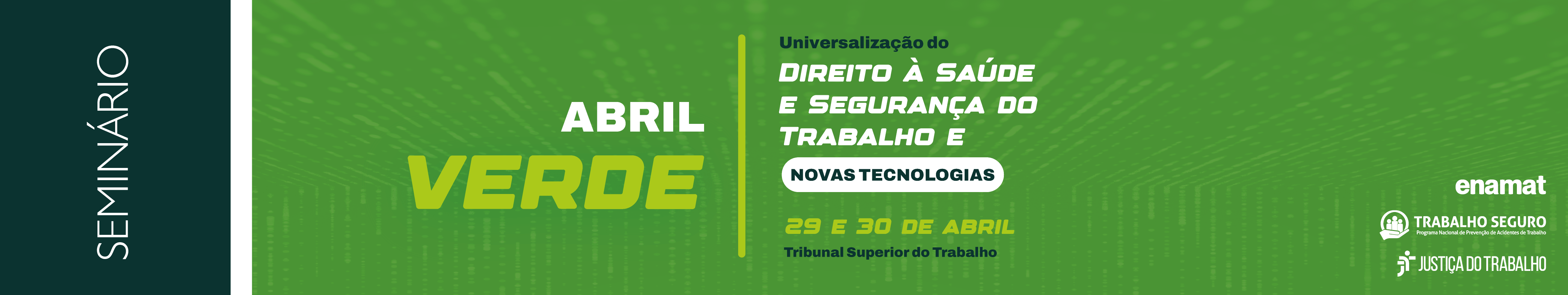 O seminário, que está sendo promovido em parceria com a Escola Nacional de Formação e Aperfeiçoamento de Magistrados do Trabalho (Enamat), faz parte das ações do programa para o Abril Verde, iniciativa que busca conscientizar a população sobre a importância da saúde e segurança no trabalho. O tema do biênio do programa é "Universalização do Direito à Saúde e Segurança do Trabalho e Novas Tecnologias” e tem como temática para as ações deste ano o slogan “Alerta Verde”.