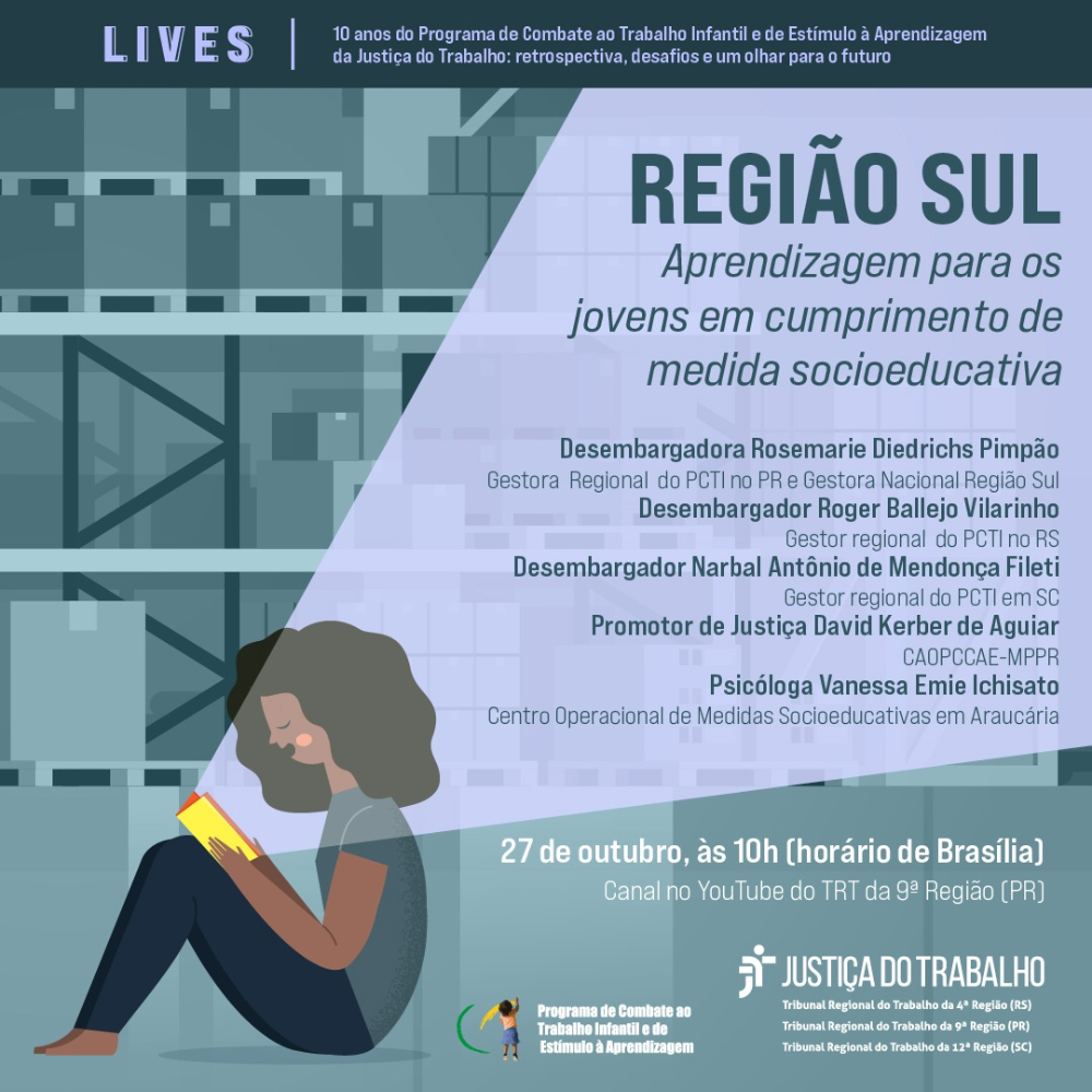 24/10/2022 - A região Sul será a próxima na sequência de cinco lives em comemoração aos 10 anos do Programa que Combate ao Trabalho Infantil e de Estímulo à Aprendizagem da Justiça do Trabalho. O tema será "Aprendizagem para os Jovens em Cumprimento de Medida Socioeducativa", em 27 de Outubro, quinta-feira, a partir das 10h, com transmissão ao vivo pelo Youtube.