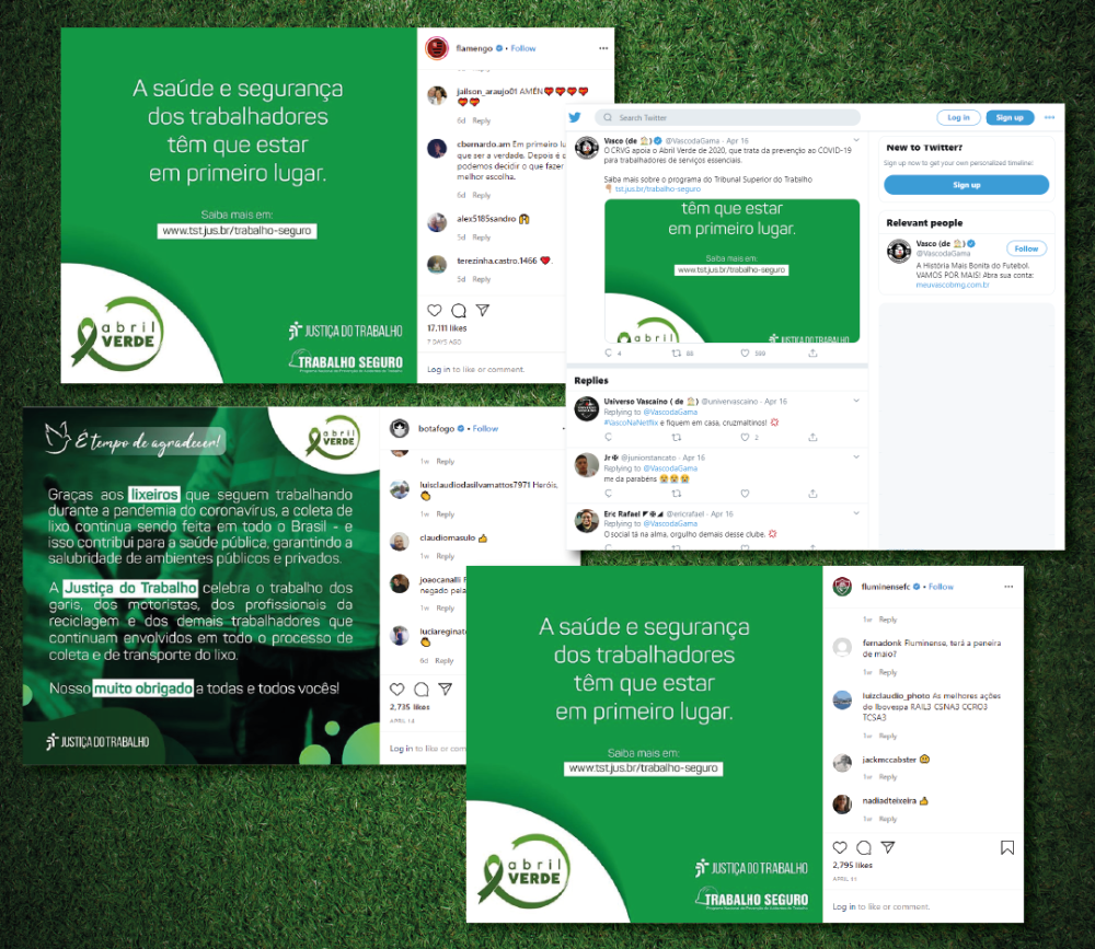 Coordenada pelo Programa Trabalho Seguro da Justiça do Trabalho, a Campanha Abril Verde ganhou o apoio dos clubes do Rio de Janeiro. Por meio de uma parceria firmada pelo Tribunal Regional do Trabalho da 1ª Região (RJ), Flamengo, Vasco, Fluminense, Botafogo, além do Boa Vista (da cidade de Saquarema-RJ), divulgaram, em suas redes sociais, mensagens e posts relacionados ao tema da campanha promovida pela Justiça do Trabalho.