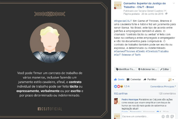 Pela primeira vez, o Conselho Superior da Justiça do Trabalho é um dos três finalistas do Prêmio Nacional de Comunicação e Justiça (Conbrascom) na categoria Mídia Digital. Neste ano, 15ª edição do prêmio, o Conselho concorre com a campanha do Facebook “Direito do Trabalho no universo de Game of Thrones”, uma série especial desenvolvida para o Facebook e que desmistifica questões trabalhistas aproveitando o sucesso da série norte-americana. O trabalho foi desenvolvido pela Divisão de Comunicação Social.