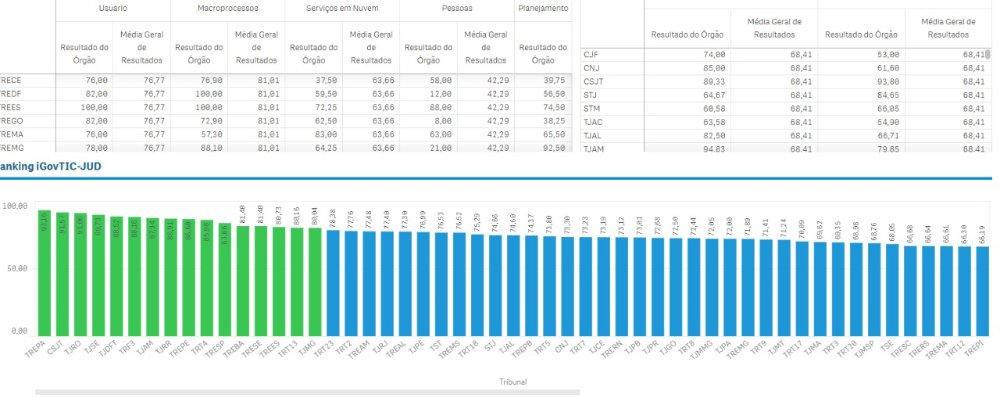 O iGovTIC-Jud é um índice de Governança de Tecnologia da Informação e Comunicação desenvolvido pelo Conselho Nacional de Justiça (CNJ) com o propósito de identificar, avaliar e acompanhar a situação da Governança, Gestão e Infraestrutura de TIC dos órgãos do Poder Judiciário. Os resultados completos estão disponíveis no painel interativo iGovTIC-JUD – Resultado Geral.