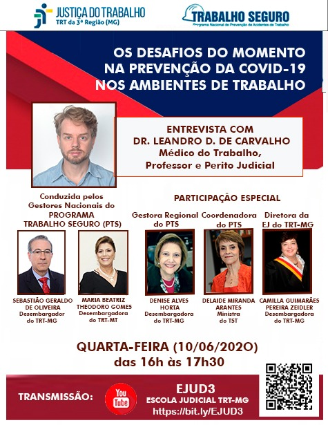 O Programa Trabalho Seguro, em parceria com a Escola Judicial do Tribunal Regional do Trabalho da 3ª Região (MG), promove, na próxima quarta-feira (10), das 16h às 17h30, a live "Os desafios do momento na prevenção da Covid-19 nos ambientes de trabalho". O evento contará com a participação especial da coordenadora do Programa do Trabalho Seguro, a ministra do Tribunal Superior do Trabalho Delaíde Miranda Arantes.