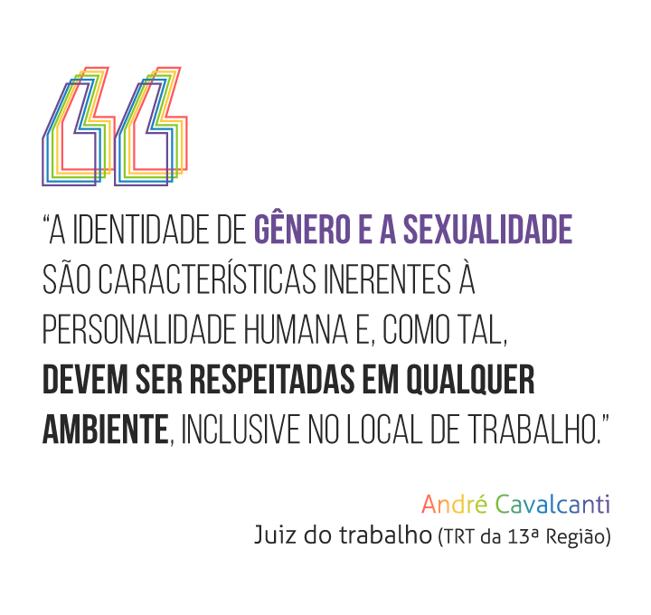 “A identidade de gênero e a sexualidade são características inerentes à personalidade humana e, como tal, devem ser respeitadas em qualquer ambiente, inclusive o local de trabalho, sob pena de inadmissível violação de direitos que compõem o patrimônio imaterial das pessoas”, explica o juiz do trabalho André Machado Cavalcanti, membro do comitê gestor nacional do Programa Trabalho Seguro do Conselho Superior da Justiça do Trabalho (CSJT) e membro do Comitê da Equidade de Gênero, Raça e Diversidade do TRT da 13ª Região (PB). Ele ressalta a importância da Justiça do Trabalho na promoção do diálogo e da conscientização, bem como na atuação institucional por políticas públicas capazes de estimular o acolhimento das diferenças.