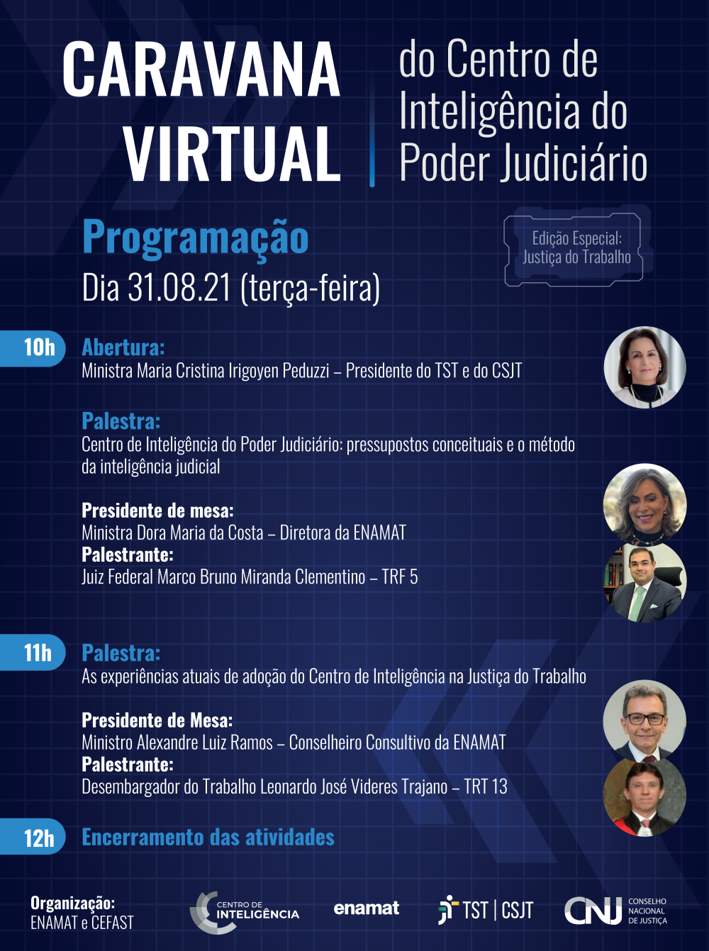 18/08/21 - A Escola Nacional de Formação e Aperfeiçoamento de Magistrados do Trabalho (Enamat) promove, no dia 31 de agosto, a Caravana Virtual do Centro de Inteligência do Poder Judiciário. Nesta edição especial, a Justiça do Trabalho será tema dos debates. A transmissão está prevista para começar às 10h e será realizada pelo canal oficial da Enamat no YouTube.