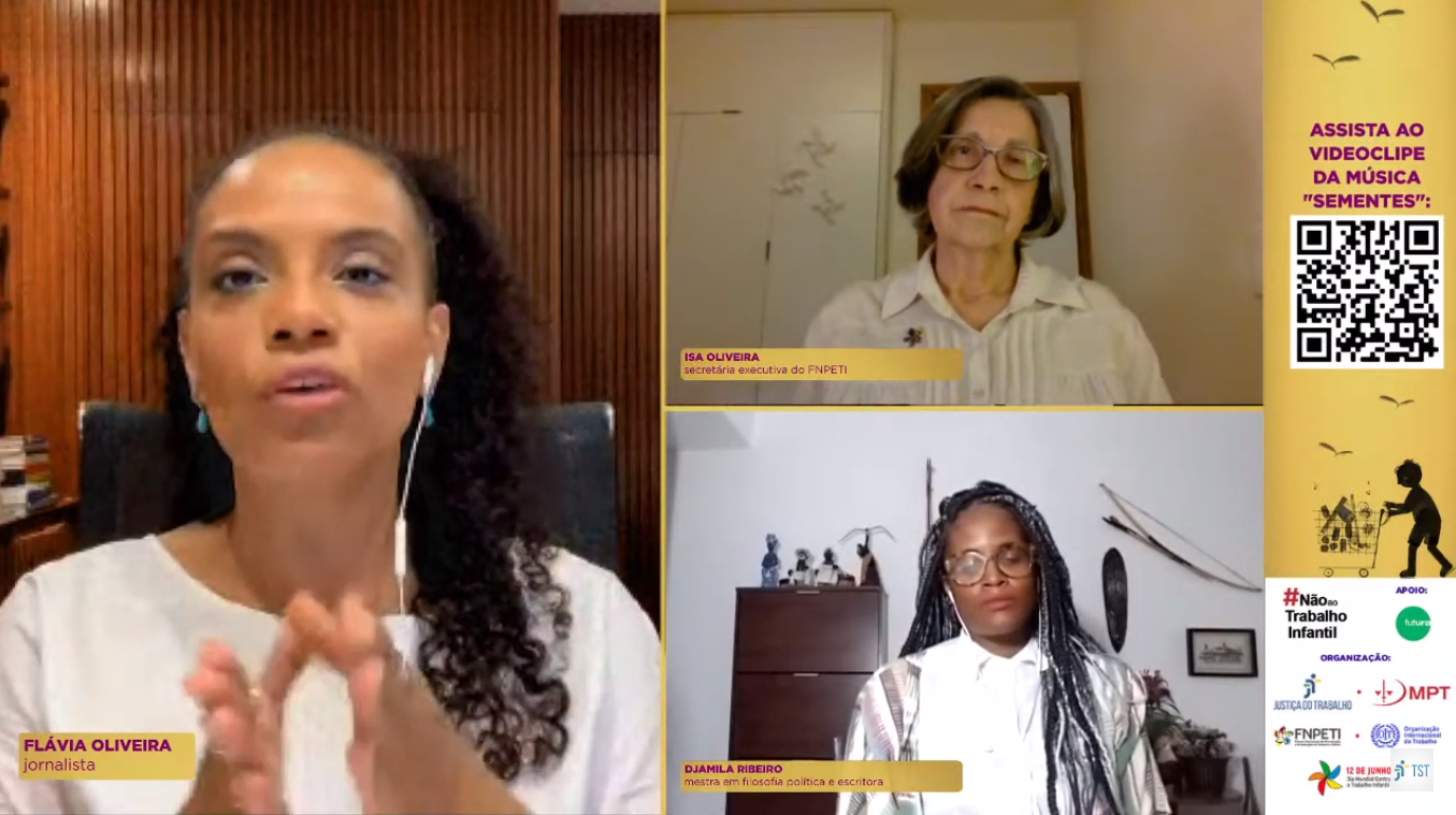 A mestra em Filosofia Política e escritora Djamila Ribeiro também participou do webinário “Covid-19: Agora mais do que nunca, protejam crianças e adolescentes do trabalho infantil" e trouxe a questão racial para o debate. De acordo com ela, qualquer discussão sobre o trabalho infantil no Brasil precisa, obrigatoriamente, abranger o histórico escravocrata e as diversas consequências na construção social do País.