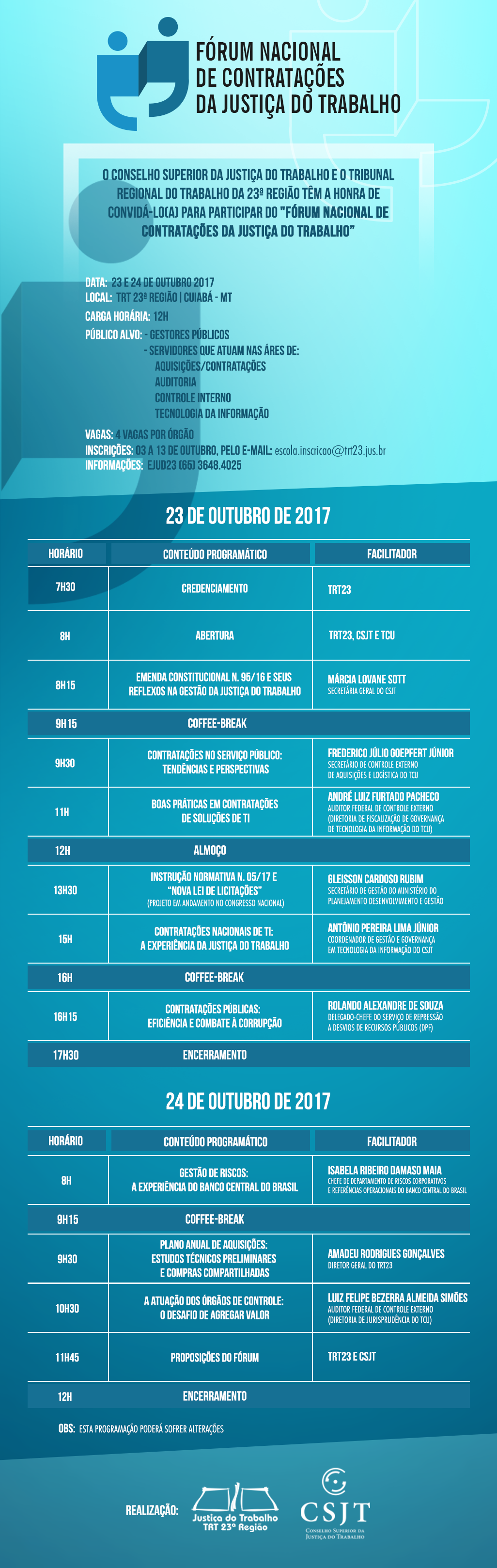 A programação contempla temas atuais a serem abordados por palestrantes do Tribunal de Contas da União (TCU), do Ministério do Planejamento, Desenvolvimento e Gestão, da Polícia Federal, do Banco Central do Brasil e dos organizadores do evento, o TRT/MT e CSJT.