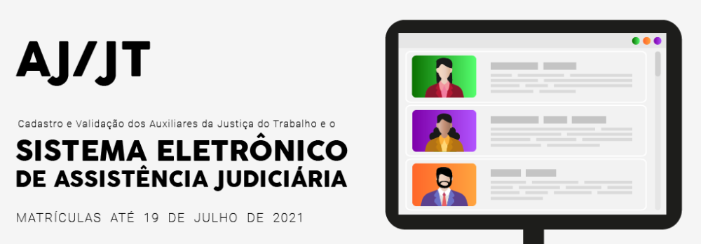 20/5/2021 - O Centro de Educação Corporativa da Justiça do Trabalho de 1º e 2º Graus (CEduc-JT) está disponibilizando em sua plataforma virtual, a partir desta quarta-feira (19/5), o curso autoinstrucional "Cadastro e Validação dos Auxiliares da Justiça do Trabalho e o Sistema Eletrônico de Assistência Judiciária AJ/JT".