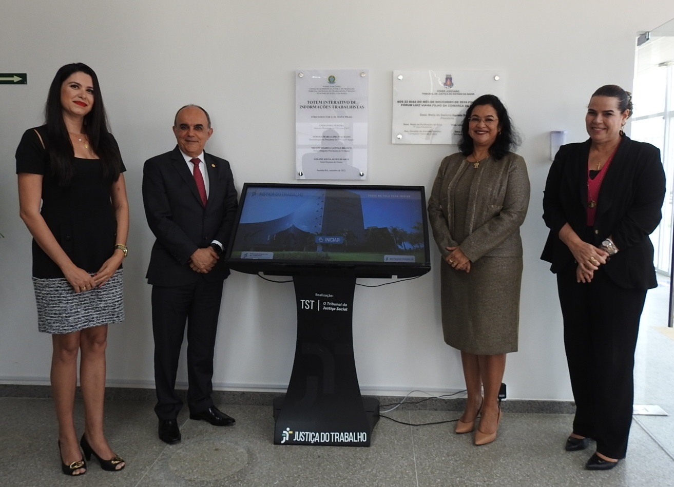 O ministro do TST Cláudio Brandão, a presidente do TRT-5 (BA) Débora Machado e as juízas do TJ Rita Ramos e Letícia Freitas ao lado do totem