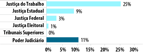 Os índices de conciliação também foram analisados e comparados em relação à fase em que o conflito se encontra. As conciliações apresentam melhores resultados na fase de conhecimento do 1º grau na Justiça do Trabalho (40% das sentenças solucionadas por homologação de acordo). Já na fase de execução esse índice cai para 5%.