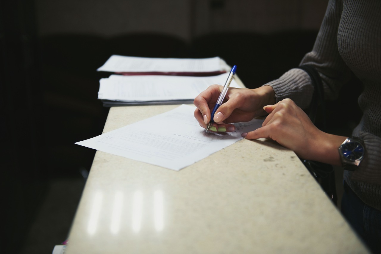 Imagem: pessoa assinando documento, sob bancada