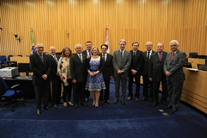 À direita, a Conselheira Maria das Graças Paranhos assina o termo de posse. À esquerda, registro com o Presidente Barros Levenhagen, conselheiros e desembargadores
