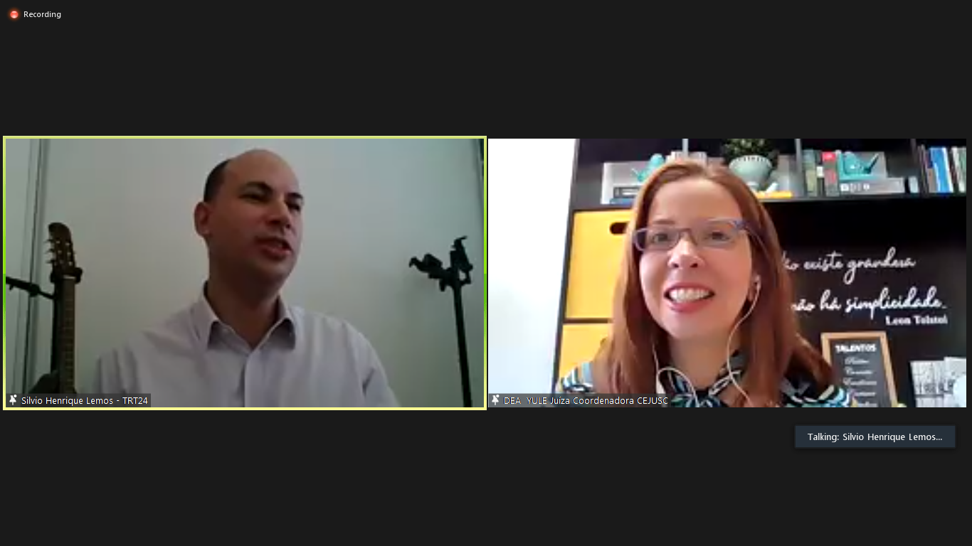Print da tela de transmissão da palestra: servidor do TRT-24 Silvio Henrique Lemos (à direita) e juíza Déa Marisa Brandão Cubel Yule (à esquerda)