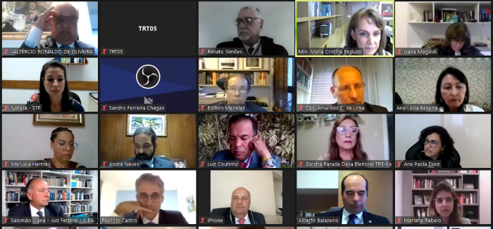 8/11/2021 - A presidente do Tribunal Superior do Trabalho e do Conselho Superior da Justiça do Trabalho, ministra Maria Cristina Peduzzi, participou virtualmente, na última sexta-feira (5), da posse da nova direção do Tribunal Regional do Trabalho da 5ª Região (BA). A cerimônia híbrida foi transmitida pelo canal do TRT-5 no YouTube.