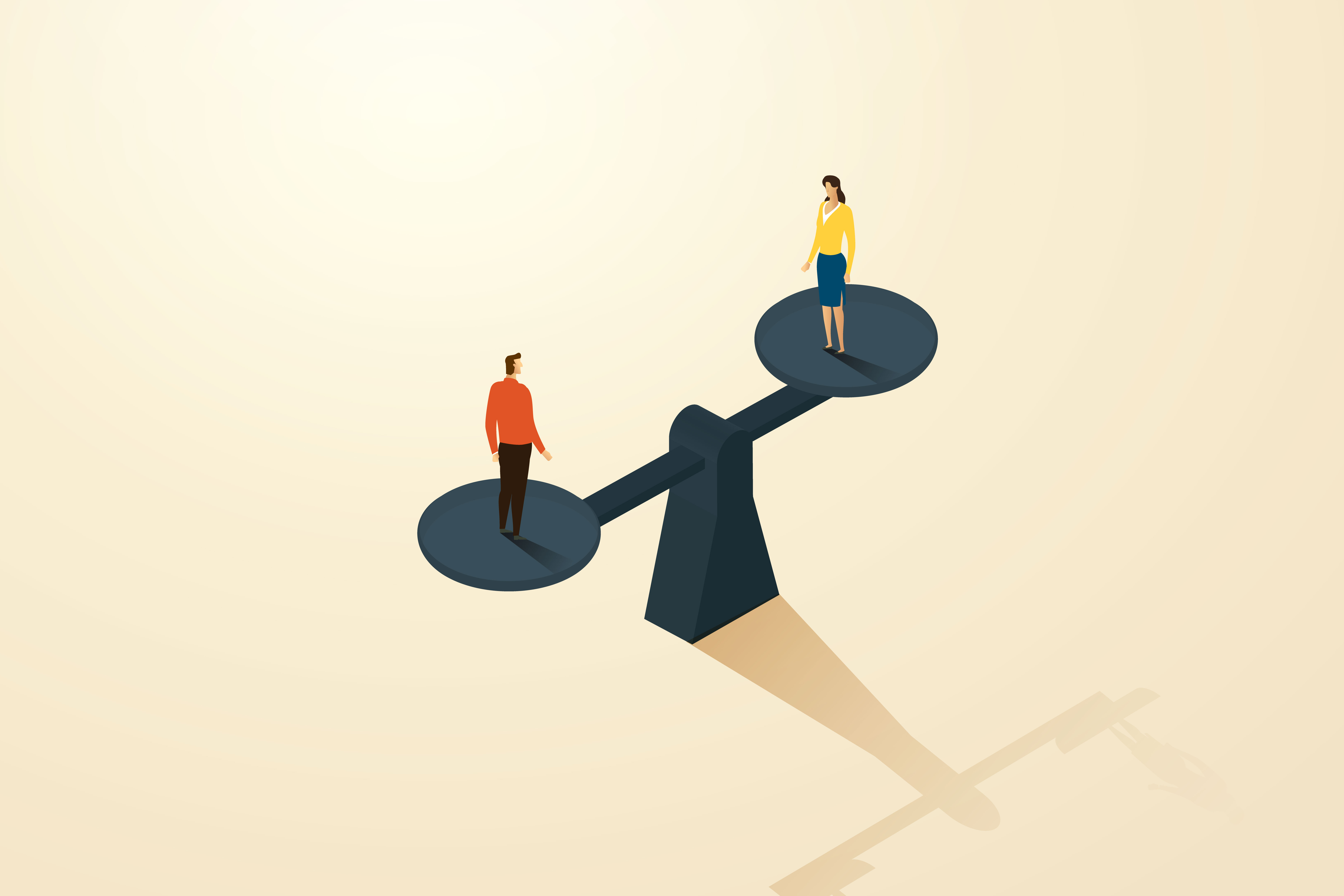 Ilustração de um homem e uma mulher em posições opostas em uma balança.
