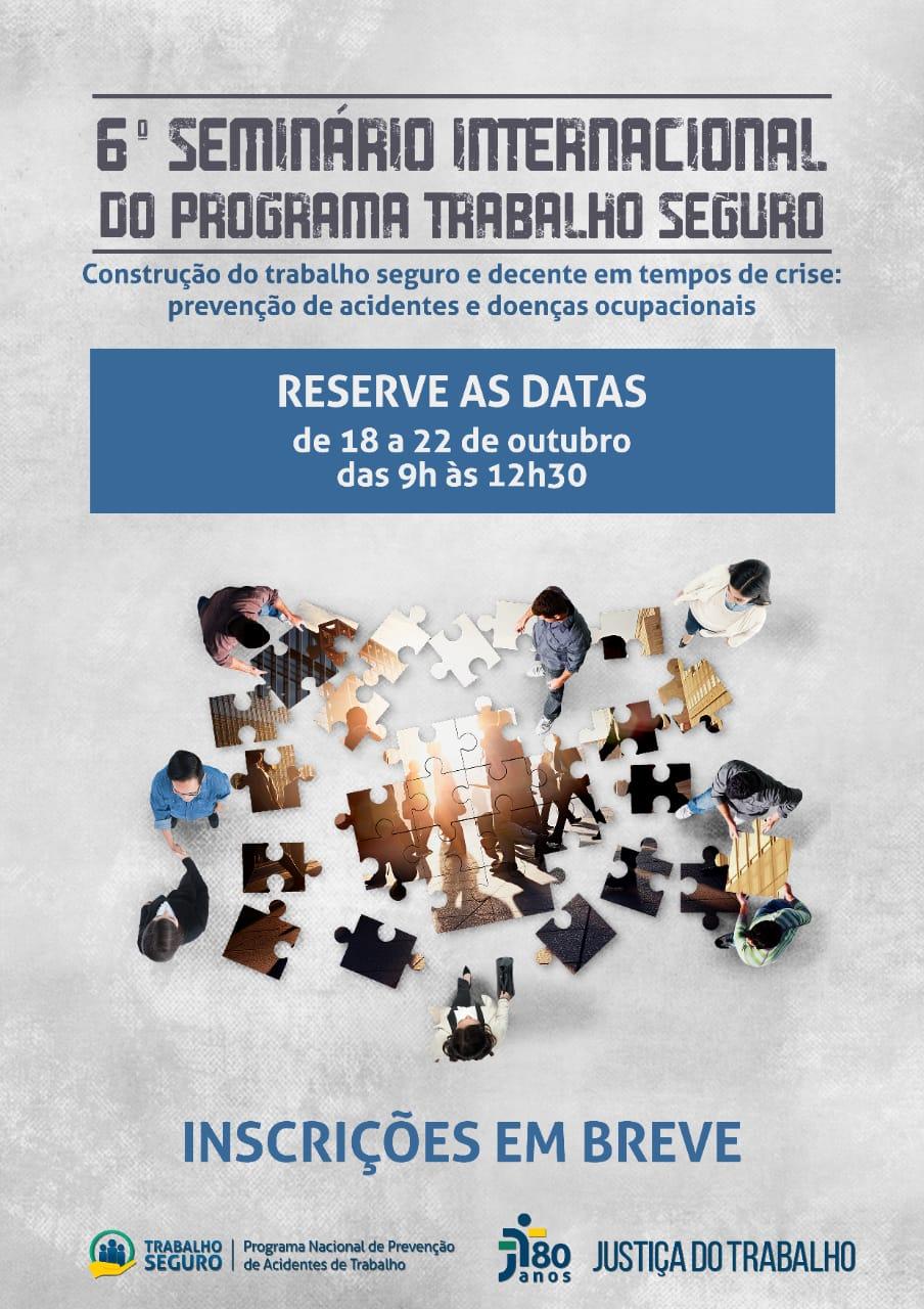 5/8/2021 - O Programa Nacional de Prevenção de Acidentes de Trabalho da Justiça do Trabalho (Programa Trabalho Seguro) promoverá, de 18 a 22 de outubro, o “6º Seminário Internacional do Programa Trabalho Seguro - Construção do trabalho seguro e decente em tempos de crise: prevenção de acidentes e doenças ocupacionais”. O evento, que será realizado das 9h às 12h30 todos os dias, terá transmissão ao vivo no canal do TST no YouTube.