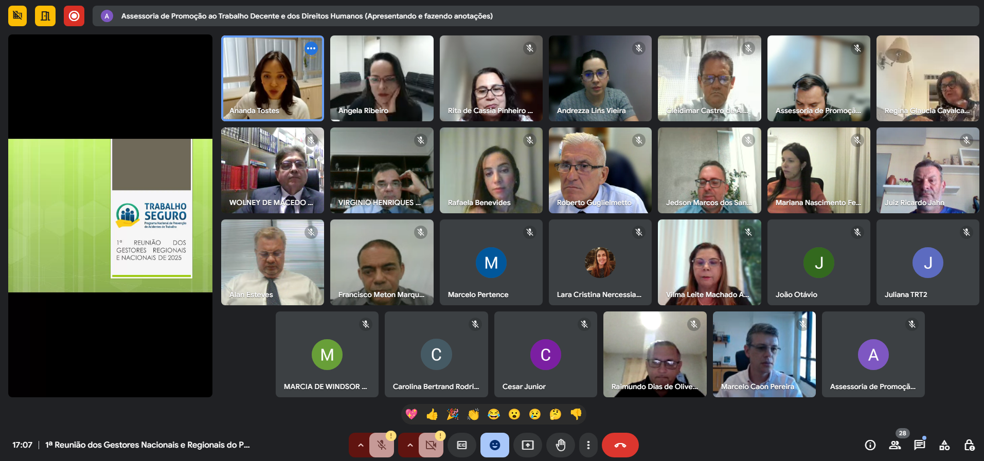 27/3/2025 - O Programa Trabalho Seguro da Justiça do Trabalho realizou na última semana as primeiras reuniões do ano com os gestores nacionais e regionais. Durante os encontros, foram discutidas as ações que serão realizadas ao longo deste ano para o fortalecimento da atuação do programa no âmbito da Justiça do Trabalho.
