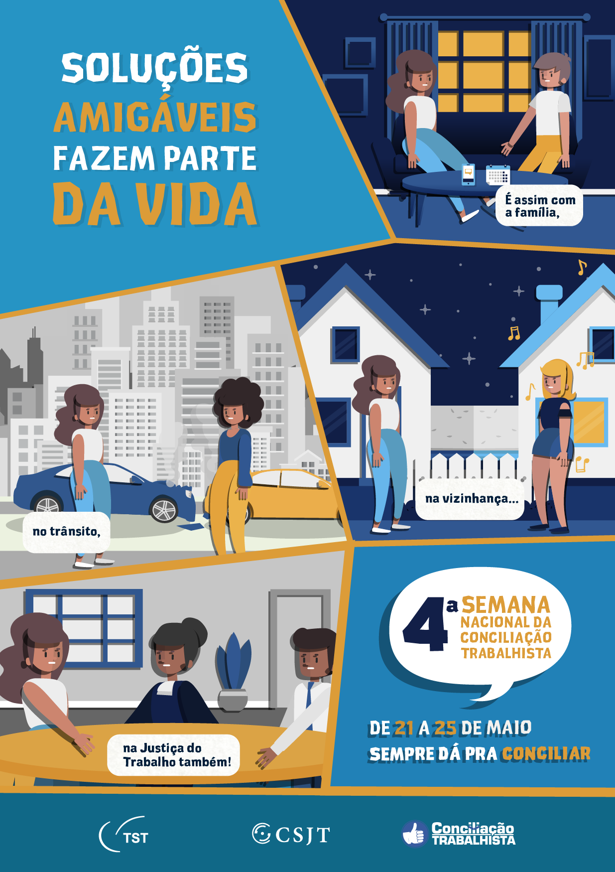 A Quarta Semana Nacional de Conciliação Trabalhista, que será realizada entre os dias 21 e 25 de maio, adotou o tema “Sempre dá para conciliar” a fim de conduzir os trabalhos em 2018. O evento é uma mobilização de toda a Justiça do Trabalho (JT) para estimular acordos entre patrões e empregados. O Conselho Superior da Justiça do Trabalho (CSJT) é o responsável por promover a parceria com os 24 Tribunais Regionais do Trabalho (TRTs) para que seja solucionado o maior número possível de processos pela via da conciliação.